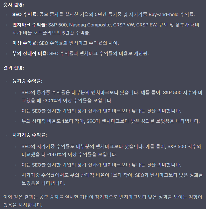 - 공모 증자를 실시한 기업의 시가가중 포트폴리오는 규모, 가치, 모멘텀 효과를 통제한 후에도 유의미하게 음의 알파를 보임.