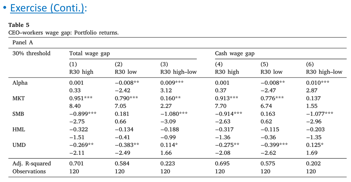 - 연습 문제: Dittman et al. (2023)은 경영자와 직원 간의 임금 격차가 큰 기업과 작은 기업의 주식 수익률을 분석하고 있다.