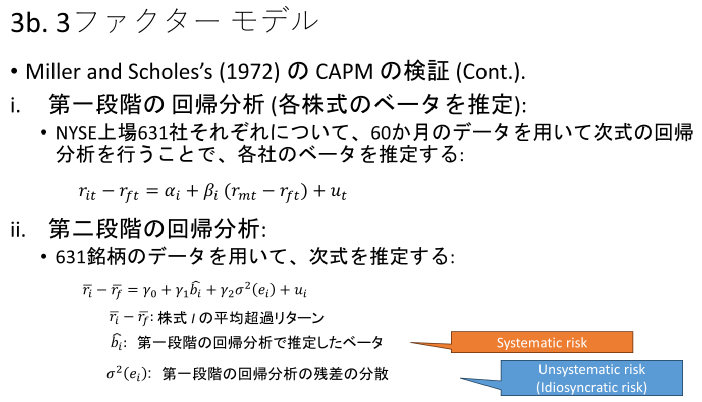 - CAPM: E(rᵢ) = rf + β [ E(rf) - rf ] → rᵢₜ - rfₜ = α + β ( rₘₜ - rfₜ) + uᵢₜ