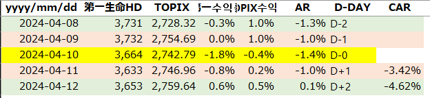 다이이치 생명의 이 발표에 대해, 3일 및 5일간의 CAR을 계산하세요: CAR(-1, 1), CAR(-2, 2). “MScSeminar_2024S_8.xlsx”의 “EventStudy” 워크시트에 수록된 다이이치 생명의 주가와 TOPIX를 사용하세요.