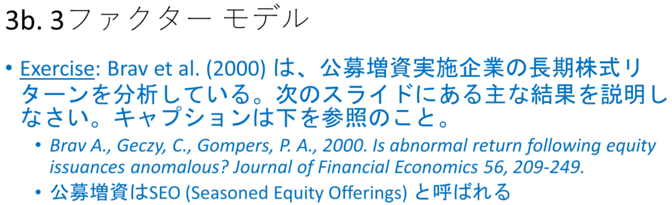 - 연습 문제: Brav et al. (2000)은 공모 증자 실시 기업의 장기 주식 수익률을 분석하고 있다. 다음 슬라이드에 있는 주요 결과를 설명하시오. 캡션은 아래를 참조할 것.