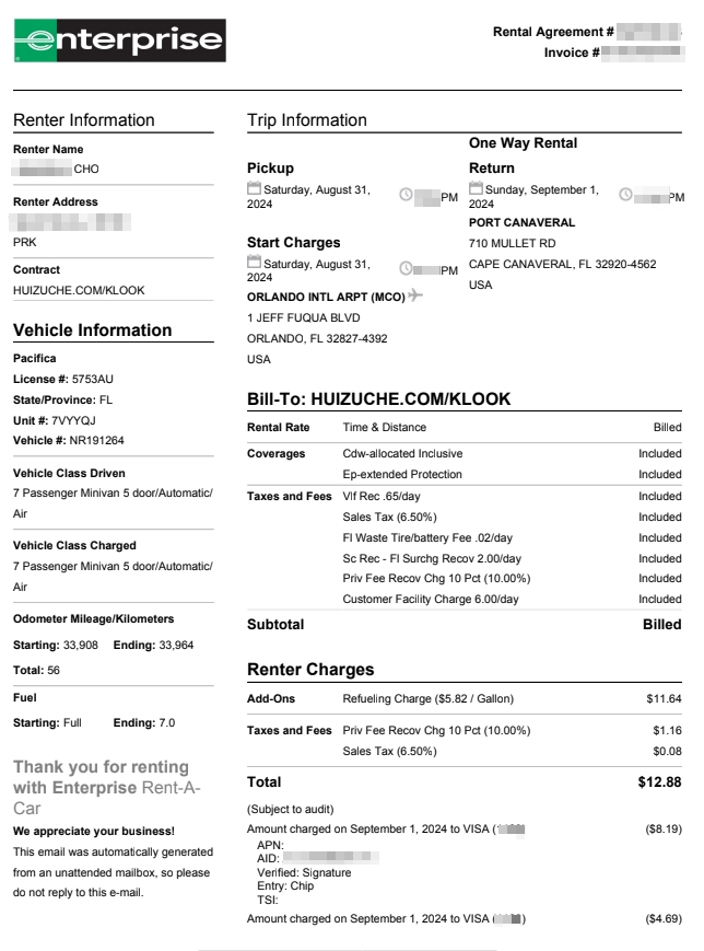 주유를 안하고 가서 추가로 12.88불이 청구가 되었는데..
